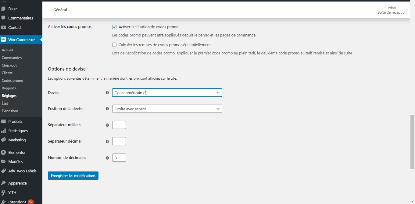 Et pour choisir la devise, vous devriez vous rendre au niveau de votre tableau de bord wordpress, puis aller vers Woocommerce > paremetres ensuite vous descendez vres le bas et vous verrez la zone de selection de la devise