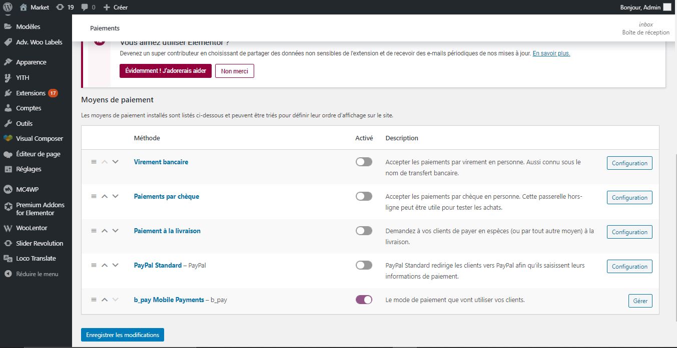 Pour activer le mode de paiement via Bpay, vous devriez vous rendre dans tableau de bord de votre wordpress puis aller vers Woocommerce > Parametres > Paiement, ensuite vous activez le paiement via bpay.