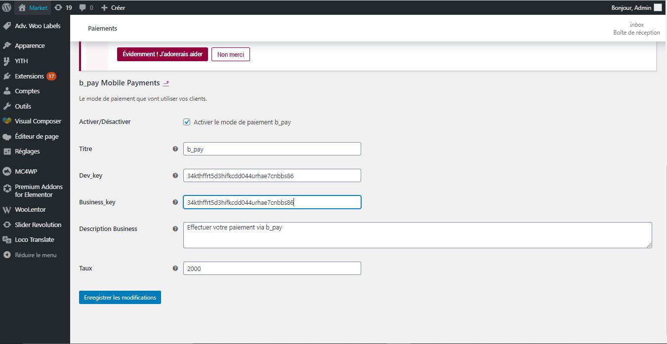 Ainsi vous avez reçu le Dev_key et le Business_key. Afin de vous permettre de recevoir des paiements de vos clients via bpay, vous devez reseigner ses informations. Et pour le faire rendez-vous toujours dans le tableau de bord de votre site wordpress puis allez vers Woocommerce > Parametres > paiement et cliquez sur gérer au niveau de bpay et renseigner vos informations. N'oubliez pas de renseigner le taux du dollar, cela permet à bpay de bien effectuer les conversions